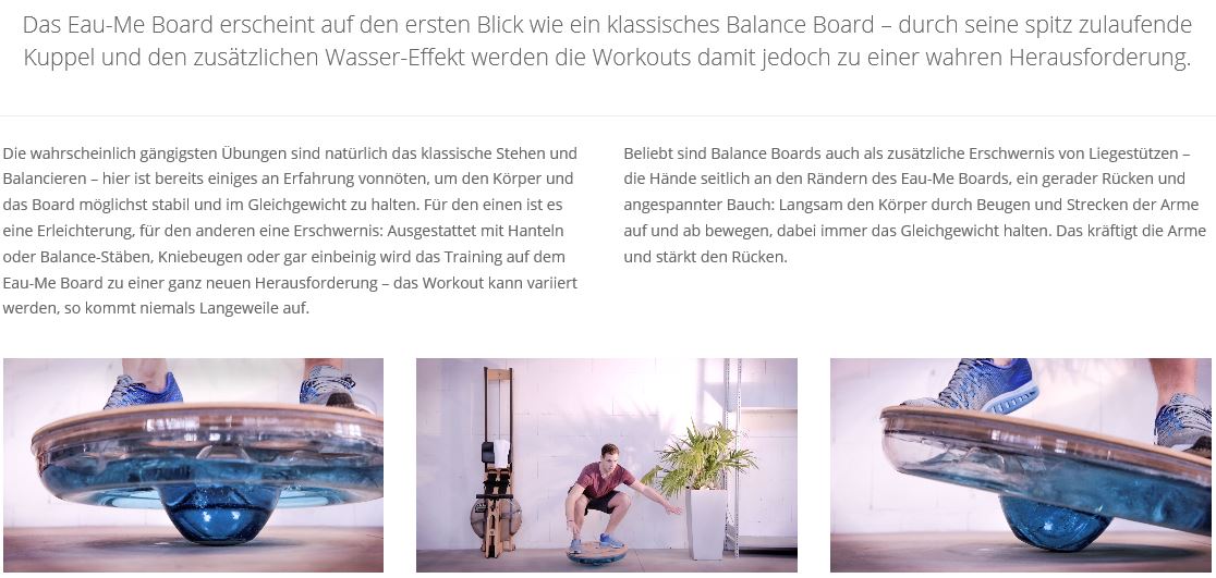 Das Eau-Me Board ist ein Balance Board der neuen Generation - die patentierte Kombination von klassischem Gleichgewichtstraining und dem Element des Wassers.