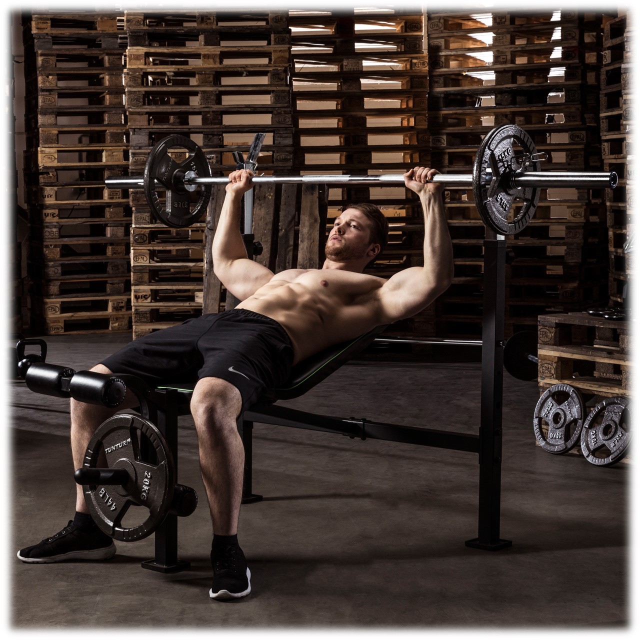 Die Bank ist nach olympischen Vorlagen ausgerichtet. Die Ständer sind für olympische Hanteln und Hantelscheiben konzipiert und können unabhängig voneinander eingestellt werden.